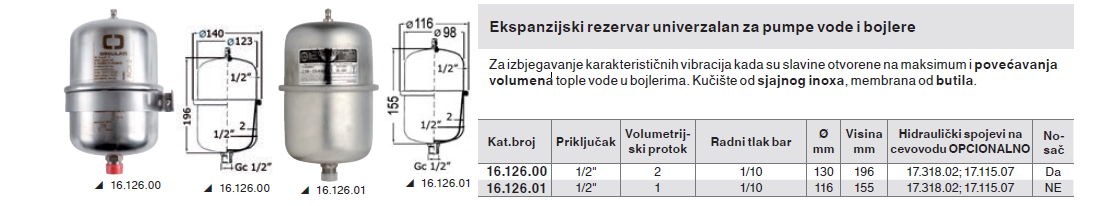 Specifikacija za Ekspanzijski rezervar univerzalan za pumpe vode i bojlere