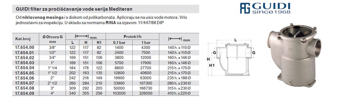 Od niklovanog mesinga i s diskom od polikarbonata. Apliciraju se na usis vode motora. Vrlo jednostavni za inspekciju. U skladu sa normama RINA sa izjavom 11/447/88 DIP.