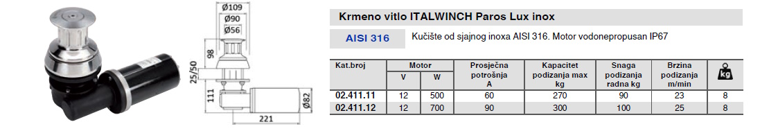 Specifikacija za Krmeno vitlo Italwinch Paros Lux inox