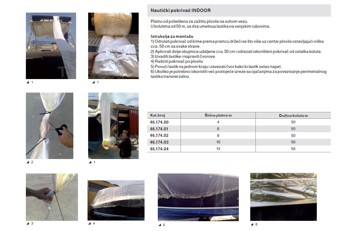 Platno od polietilena za zaštitu plovila na suhom vezu. U kolutima od 50 m, sa dva umetnua lastika na vanjskim rubovima.