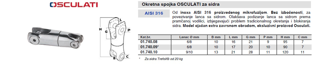Od inoxa AISI 316 proizvedenog mikrofuzijom. Bez izbočenosti, za povezivanje lanca sa sidrom. Olakšava podizanje lanca sa sidrom prema pramčanoj vodilici, izbjegavajući problem tradicionalnog okretanja i blokiranja sidra. Model ojačan extra završnom obradom.