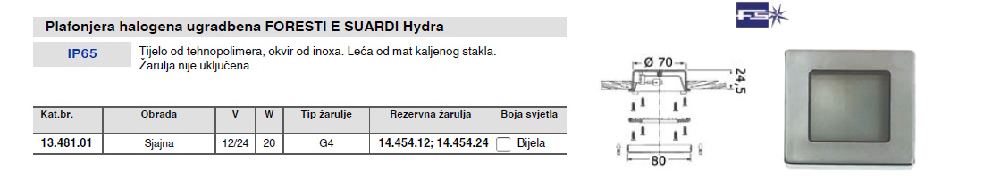 Specifikacija za Plafonjera halogena ugradbena Hydra