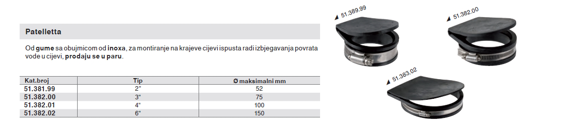 Od gume sa obujmicom od inoxa, za montiranje na krajeve cijevi ispusta radi izbjegavanja povrata vode u cijevi, prodaju se u paru.