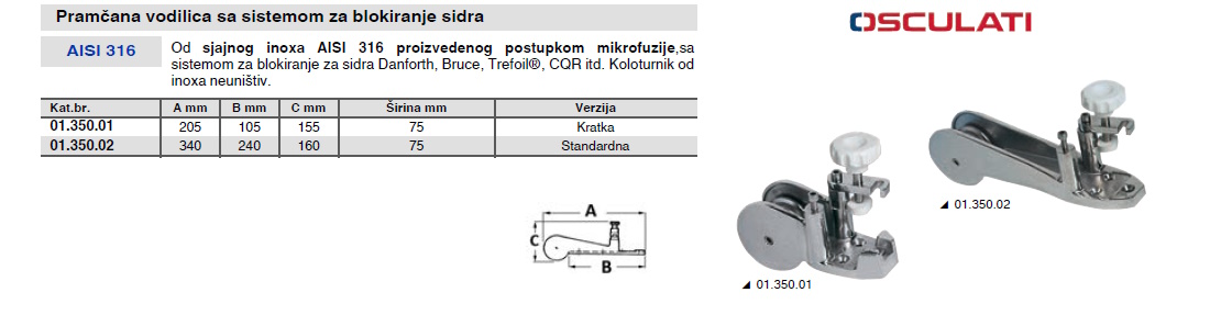 Od sjajnog inoxa AISI 316 proizvedenog postupkom mikrofuzije,sa sistemom za blokiranje za sidra Danforth, Bruce, Trefoil®, CQR itd. Koloturnik od inoxa neuništiv.