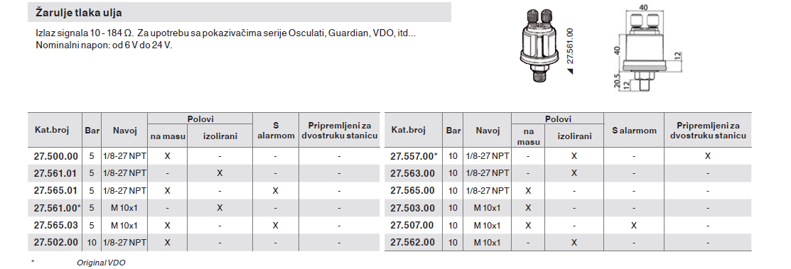 O proizvodu pritisak ulja VDO - 5 bar, 1/8-27 NPT, polovi A masa