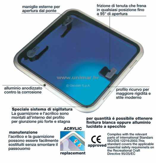 S vanjskim ručkama za otvaranje izvana i držačem-kočnicom za otvorenost u bilo kojem položaju čak i pod 95°. Od anodiziranog aluminija za zaštitui od korozije i sa zaobljenim profilom radi veće čvrstoće. Kod narudžbi većeg broja palubnih prozora moguće ih je dobiti s okvirom u bijeloj boji ili od sjajnog aluminija.