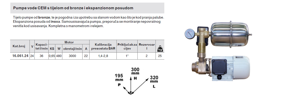 O proizvodu pumpa vode CEM brončana s ekspanzionom posudom - 36l/min 24V