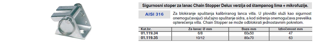 Za blokiranje spuštanja kalibriranog lanca vitla. U plovidbi služi kao sigurnost onemogućavajući slučajno spuštanje sidra, a kod sidrenja onemogućava prevelika opterećenja vitla. Chain Stopper se može odblokirati jednostavnim pokretom.