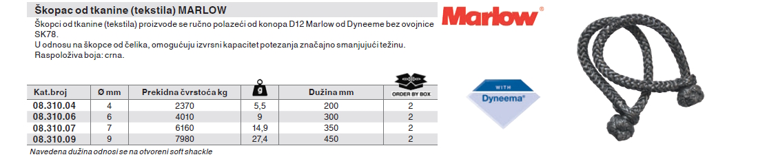 Škopci od tkanine (tekstila) proizvode se ručno polazeći od konopa D12 Marlow od Dyneeme bez ovojnice SK78. U odnosu na škopce od čelika, omogućuju izvrsni kapacitet potezanja značajno smanjujući težinu. Raspoloživa boja: crna.