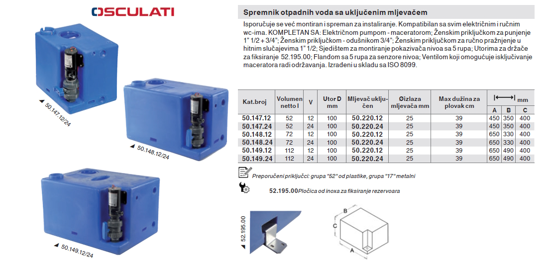 Isporučuje se već montiran i spreman za instaliranje. Kompatibilan sa svim električnim i ručnim wc-ima. KOMPLETAN SA: Električnom pumpom - maceratorom; Ženskim priključkom za punjenje 1” 1/2 + 3/ 4”; Ženskim priključkom - odušnikom 3/4”; Ženskim priključkom za ručno pražnjenje u hitnim slučajevima 1” 1/2; Sjedištem za montiranje pokazivača nivoa sa 5 rupa; Utorima za držače za fiksiranje 52.195.00; Flanđom sa 5 rupa za senzore nivoa; Ventilom koji omogućuje isključivanje maceratora radi održavanja. Izrađeni u skladu sa ISO 8099.