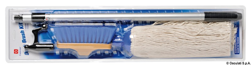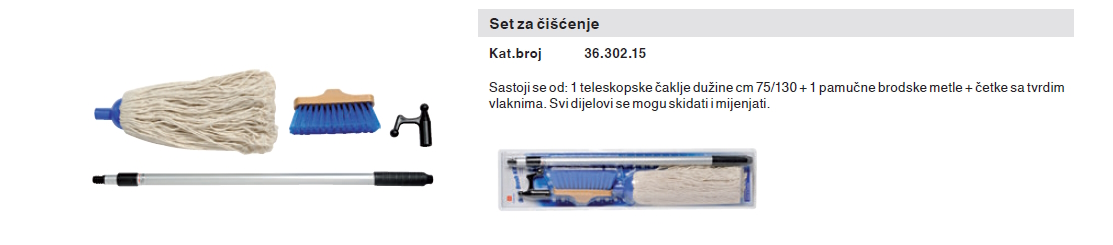 Sastoji se od: 1 teleskopske čaklje dužine cm 75/130 + 1 pamučne brodske metle + četke sa tvrdim vlaknima. Svi dijelovi se mogu skidati i mijenjati.