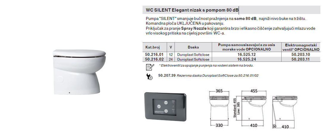 Pumpa SILENT smanjuje bučnost pražnjenja na samo 80 dB, najniži nivo buke na tržištu. Komandna ploča UKLJUČENA u pakovanju. Priključak za pranje Spray Nozzle koji garantira brzo i efikasno čišćenje zahvaljujući mlazu vode vrlo visokog pritiska na cijeloj površini WC-a.