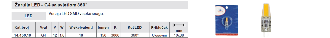 Specifikacija za Žarulja LED G4 sa svjetlom 360°