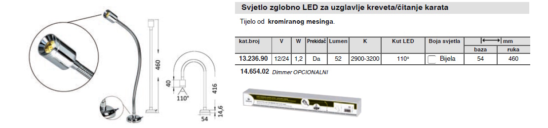 O proizvodu svjetlo zglobno LED za uzglavlje kreveta 12/24V - kromirani mesing